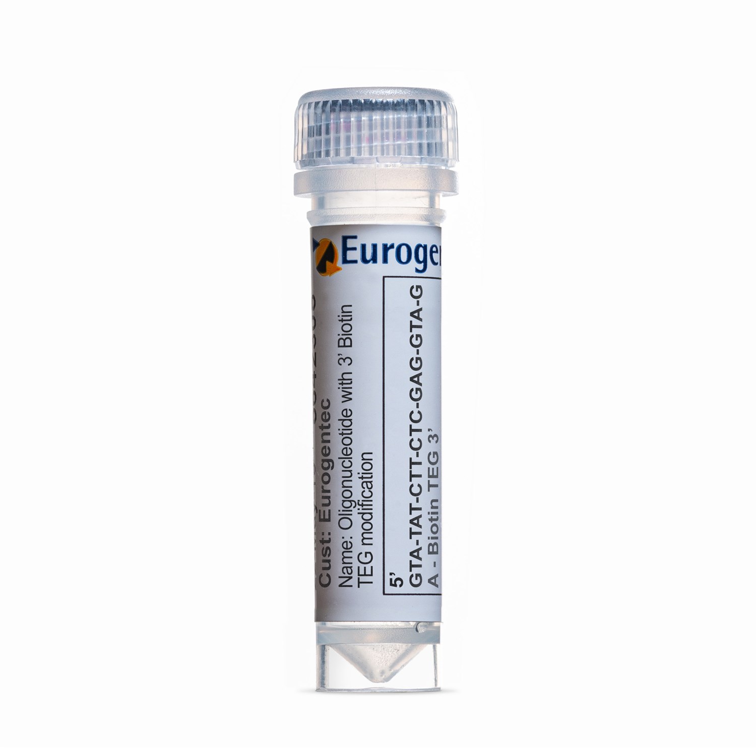 Biotin-TEG contains a 16-atom mixed polarity spacer based on a triethylene glycol containing 4 oxygen atoms. These O-atoms confer some hydrophilic properties to the arm. This biotin phosphoramidite can be branched allowing the introduction of multiple biotins both at the 5’ or 3’ ends of the oligonucleotide. The 16-atom spacer of Biotin-TEG provides the biotin with good accessibility towards the streptavidin. In addition, the presence of a few O-atoms within the arm renders it more linear in comparison to other more hydrophobic arms when used in aqueous buffers for hybridization experiments.