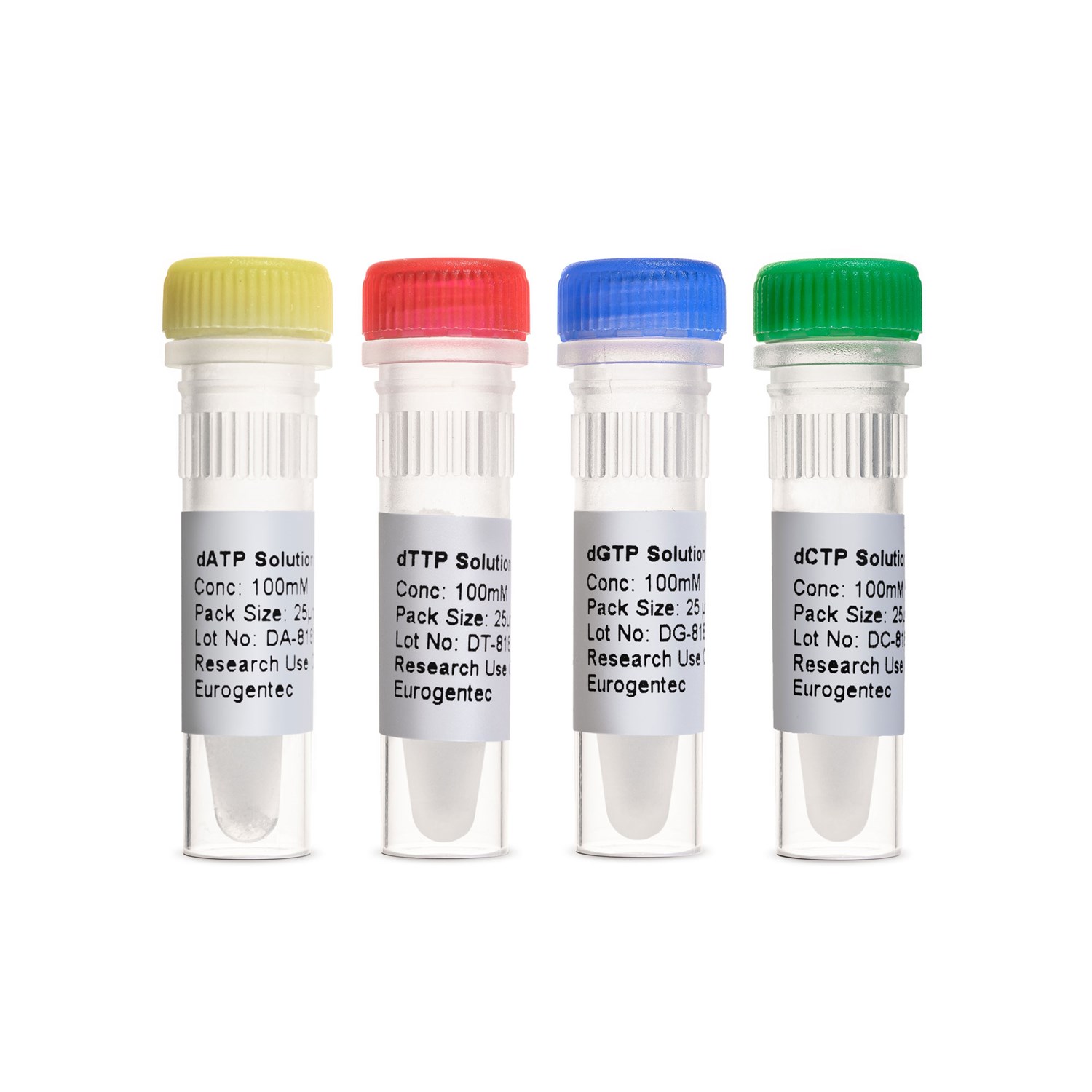 • The package contains: - One tube (250 µL) of dTTP 100 mM - One tube (250 µL) of dATP 100 mM - One tube (250 µL) of dCTP 100 mM - One tube (250 µL) of dGTP 100 mM