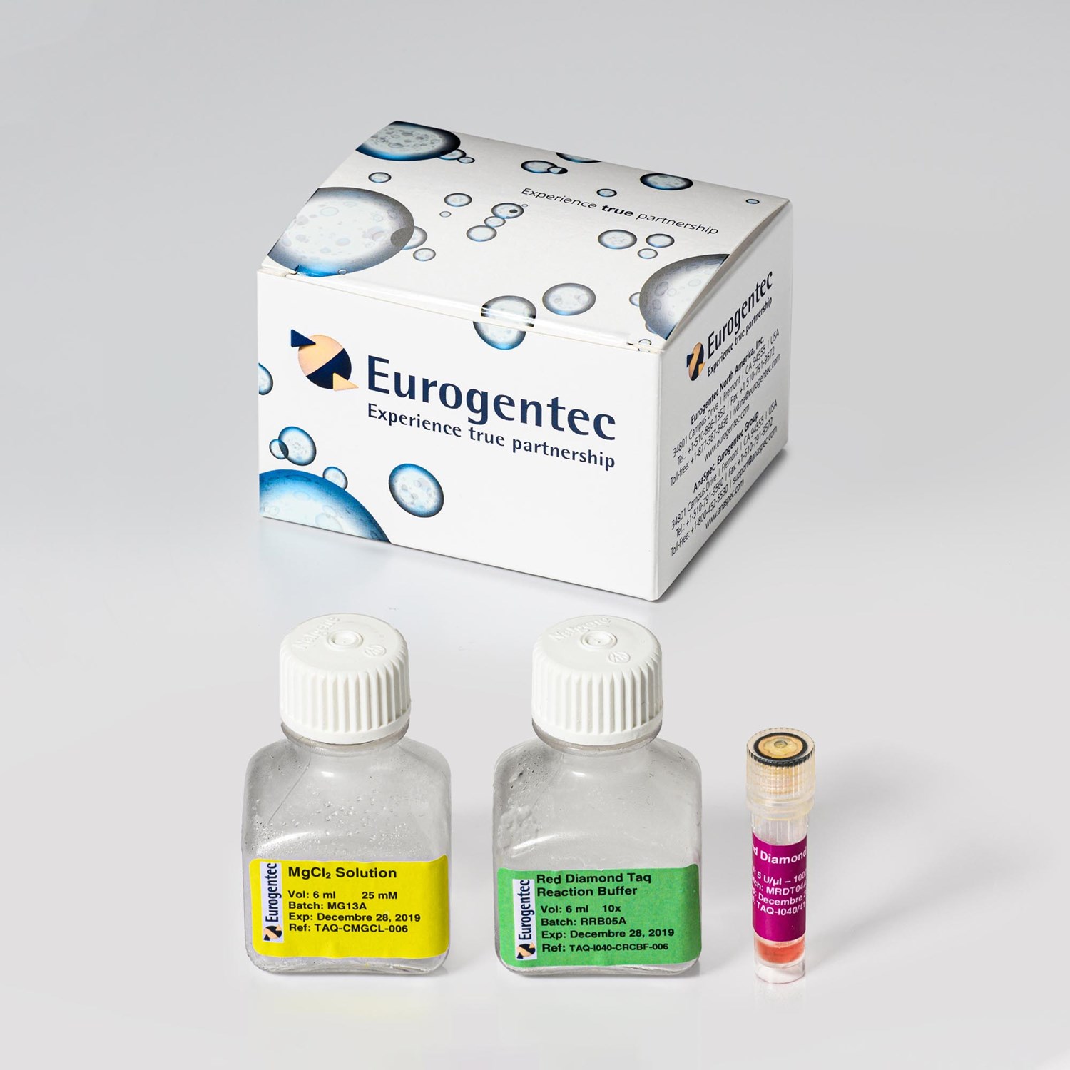 Red Diamond Taq® polymerase is a highly thermostable enzyme produced and purified from recombinant Escherichia coli bacterium containing the Thermus aquaticus DNA Polymerase gene. The expressed enzyme catalyzes 5’-3’ synthesis of DNA with no detectable 3’-5’ proof reading exonuclease activity. This enzyme has the “extendase” activity allowing TA cloning.
