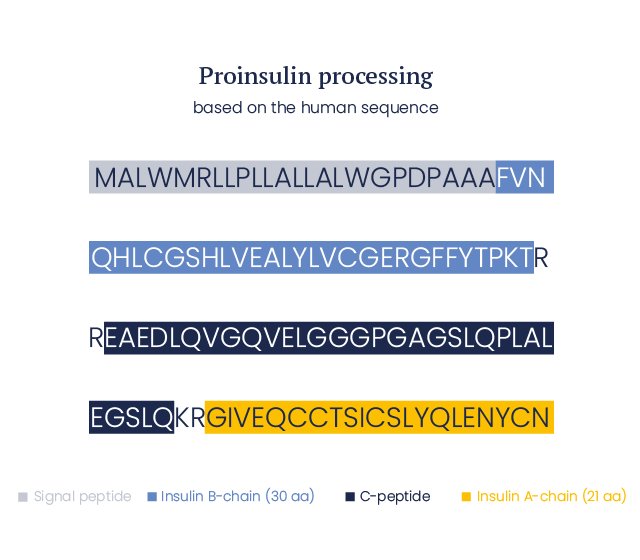 Insulin is processed from its proinsulin precursor together with C peptide (connecting peptide). The human insulin protein is composed of 51 amino acids and is a dimer of an A-chain and a B-chain, which are linked together by disulfide bonds.