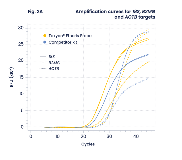 Fig. 2A. Amplification curves obtained with Takyon® Etheris Probe qPCR Master Mix (orange) and a competitor kit (blue) in a triplex assay targeting 18S, B2MG, and ACTB genes. Each reaction was performed in triplicate using 5 ng of DNA template according to the respective manufacturer’s protocols.