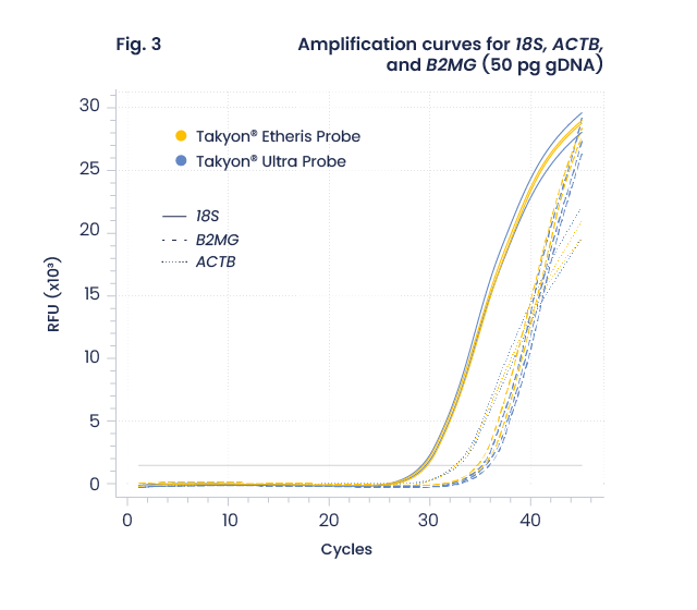 Fig. 3. Amplification curves obtained with Takyon® Etheris Probe qPCR Master Mix (orange) and Takyon® Ultra Probe qPCR Master Mix (blue) for amplification of three human targets: 18S, ACTB, and B2MG. Each reaction was performed in triplicate using 50 pg of human genomic DNA as template.